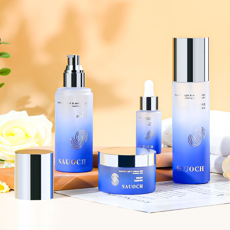 Featuring a stylish blue gradient frosted finish and silver electroplated caps, this skincare packaging set offers a premium appearance that enhances the visual appeal of skincare products.